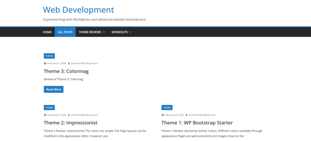 Theme 1 Review: Bootstrap Starter Colors: Different colors available through appearance Pages are well presented and images show on the preview without having to click on the post title You can add sub pages/posts to the menu items Wide option of widgets The layout is simple Lots of Appearances options…